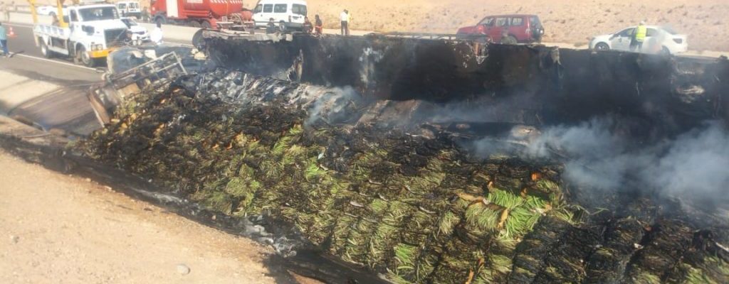 أتت ألسنة اللهب على شاحنة من الحجم الكبير، مساء الجمعة 14 يونيو الجاري، في يحن أصيب سائقها بجروح طفيفة، على مستوى النقطة الكيلومترية 268 بالطريق السيار الرابط بين مدينتي أكادير ومراكش، بالقرب من دوار قرية الشمس بتراب جماعة المزوضية.