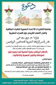 بمناسبة الذكرى الـ 50 لحدث المسيرة الخضراء المظفرة… والقرار الأممي التاريخي حول الصحراء المغربية، وتزامنا مع مرور ربع قرن على تأسيس الرابطة المغربية للصحافيين الرياضيين، تحتضن مدينة القنيطرة يوم الجمعة 7 نونبر الجاري، فعاليات ملتقى محمد بوعبيد للإعلاميين الرياضيين» والذي تنظمه تحت شعار : ” الإعلام الرياضي ركيزة أساسية في ترسيخ قيم المواطنة والقيم المهنية والأخلاقية “، بقاعة الندوات لغرفة التجارة والصناعة والخدمات لجهة الرباط سلا القنيطرة .