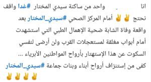 بعد وفاة فتاة في مقتبل العمر من جراء الإهمال الطبي أمام مستعجلات القرب بسيدي المختار، تنوي الساكنة المحلية تنظيم احتجاج تندد من خلاله بالوضع المزري الذي باتت تعيشه مستعجلات القرب والمركز الصحي المحلي بسيدي المختار، الشيء الذي يتنافى مع كرامة المواطن ويتجاوز كل الخطوط الحمراء تجاة حفظ وصون حياة الإنسان في هذا الوطن العزيز.