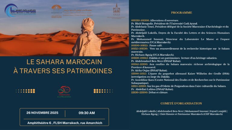 يُنظم مختبر المغرب والفضاء المتوسطي بشراكة مع الجمعية المغربية للأركيولوجيا والتراث لقاءً علمياً يوم الأربعاء المقبل بكلية الآداب والعلوم الإنسانية بمراكش التابعة لجامعة القاضي عياض، تحت عنوان: “الصحراء المغربية عبر تراثها”. ويأتي هذا اللقاء في إطار الأنشطة العلمية الهادفة إلى تعزيز البحث الأكاديمي في قضايا التراث والهوية، وتسليط الضوء على الامتداد الحضاري للمغرب داخل عمقه الصحراوي.