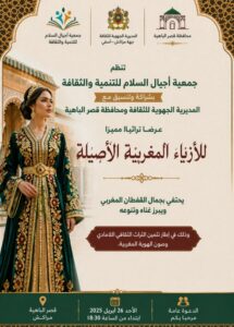تنظم جمعية أجيال السلام للتنمية والثقافة، بشراكة وتنسيق مع المديرية الجهوية للثقافة ومحافظة قصر الباهية، عرضًا تراثيًا للأزياء المغربية الأصيلة، يحتفي بالقفطان المغربي ويبرز تنوعه وغناه، وذلك يوم 26 أبريل ابتداءً من الساعة السادسة والنصف مساءً، بفضاء القصر بمدينة مراكش، في سياق تثمين التراث الثقافي اللامادي وصون الهوية الوطنية.