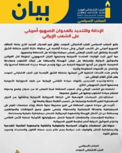 يتابع المكتب السياسي للحزب الاشتراكي الموحد، بقلق كبير العدوان الجديد الذي يشنه التحالف الصهيو-أمريكي على الشعب الإيراني وعلى سيادة أراضيه، في محاولة حثيثة لتغيير منطقة الشرق الأوسط، وإطلاق اليد للكيان الإرهابي لفرض سيطرته وإرادته على المنطقة وشعوبها.