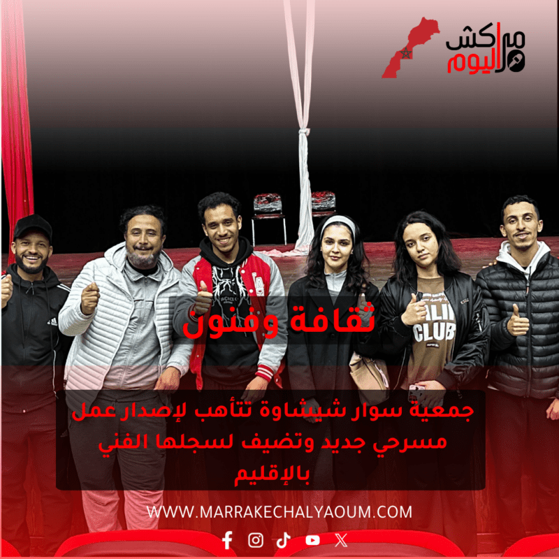 في مدينة شيشاوة ماتزال شعلة الفن المسرحي متقدة، بل إنها تزداد وهجا رفقة كل حدث جديد، حيث شهد المركز الثقافي بشيشاوة احتضان فعاليات الإقامة الفنية الخاصة بإنتاج عرض مسرحي جديد من تنظيم جمعية سوار للثقافة والفن، خلال الفترة الممتدة من يوم 24 إلى 28 يناير 2026م، وذلك بتعاون مع المديرية الجهوية لوزارة الشباب والثقافة والتواصل – قطاع الثقافة بجهة مراكش آسفي.
