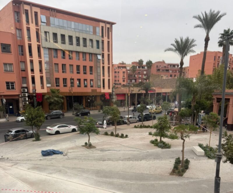 المشهد يثير الدهشة والضحك معاً: عمال يحيطون الساحة بشريط أحمر، سيارات متوقفة بحذر، والمارة يتساءلون: “واش الساحة عيّات؟ ولا التصميم ما تحمّل الشمس ديال مراكش؟”
