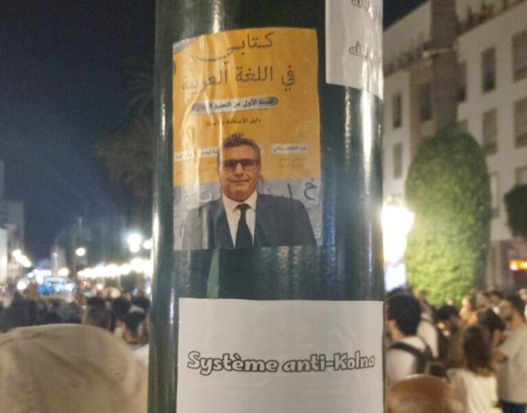 مساء اليوم، الأحد، شهدت شوارع العاصمة الرباط حملة غير مسبوقة من السخرية السياسية، حيث أقدم عدد من شباب حركة “Z” على لصق ملصقات تحمل صورة رئيس الحكومة عزيز أخنوش، صُممت على هيئة غلاف كتاب مدرسي في مادة اللغة العربية موجّه لتلاميذ السنة الأولى ابتدائية.