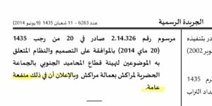 هذا التصميم، الذي يُعد بمثابة إعلان للمنفعة العامة، يشمل العقار موضوع الشكاية، ويخول قانونياً نزع ملكية البقع المخصصة للمرافق. ووفقاً للقانون، فإن إعلان المنفعة العامة يظل ساري المفعول لمدة عشر سنوات ابتداءً من تاريخ نشره في الجريدة الرسمية، أي إلى غاية 09 يونيو 2024.