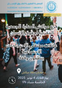 ينظم فرع المنارة – مراكش للجمعية المغربية لحقوق الانسان بتنسيق مع عائلات معتقلي الاحتجاجات الاجتماعية ، وقفة احتجاجية يوم الثلاثاء 4 نونبر الجاري، بساحة باب دكالة . ويذكر أن المحكمة الابتدائية سبق أن ادانت عددا من الشبان الذين شاركوا في الاحتجاجات التي عرفتها مدينة مراكش اسوة بالعديد من المدن المغربية في إطار جيل Z ، الا ان بعضها شهد انفلاتات أمنية و تخريب ممتلكات الغير و مواجهة قوات الأمن و اضرام النار .