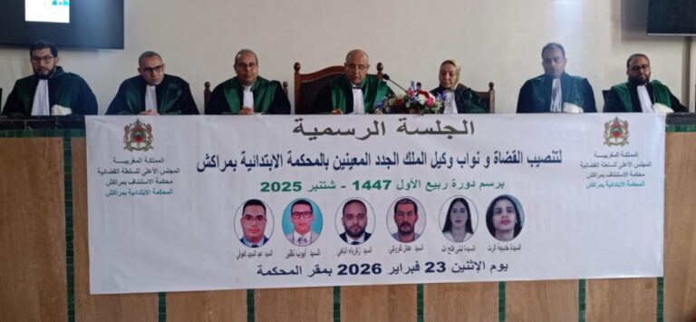 الأستاذ محمد دحان يترأس حفل تنصيب قضاة جدد بالمحكمة الابتدائية بمراكش ترأس رئيس المحكمة الابتدائية بمراكش، الأستاذ محمد دحان، يوم الاثنين 23 فبراير 2026، حفل...