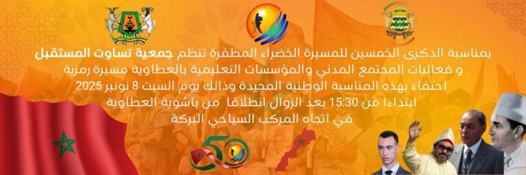 تستعد جمعية تساوت بمدبنة العطاوية لتنظيم ندوة وطنية احتفاءً بالذكرى الخمسين للمسيرة الخضراء المظفرة، وذلك يوم السبت 8 نونبر 2025بـمركب البركة بالمدينة نفسها ، وذلك...